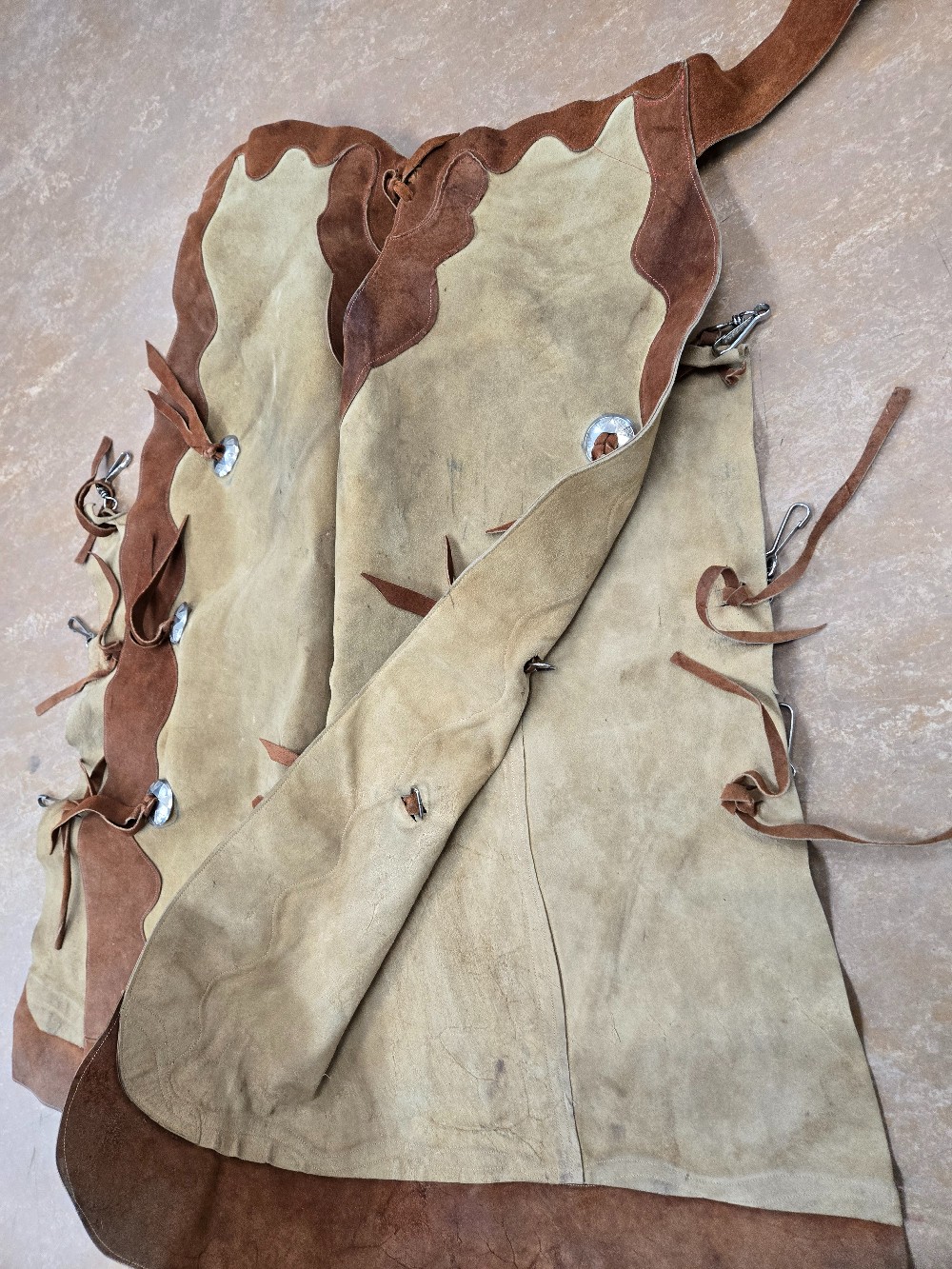 Home / Chaps, Chinks And Shotguns / Tan Suede Chaps / Conchos S/M