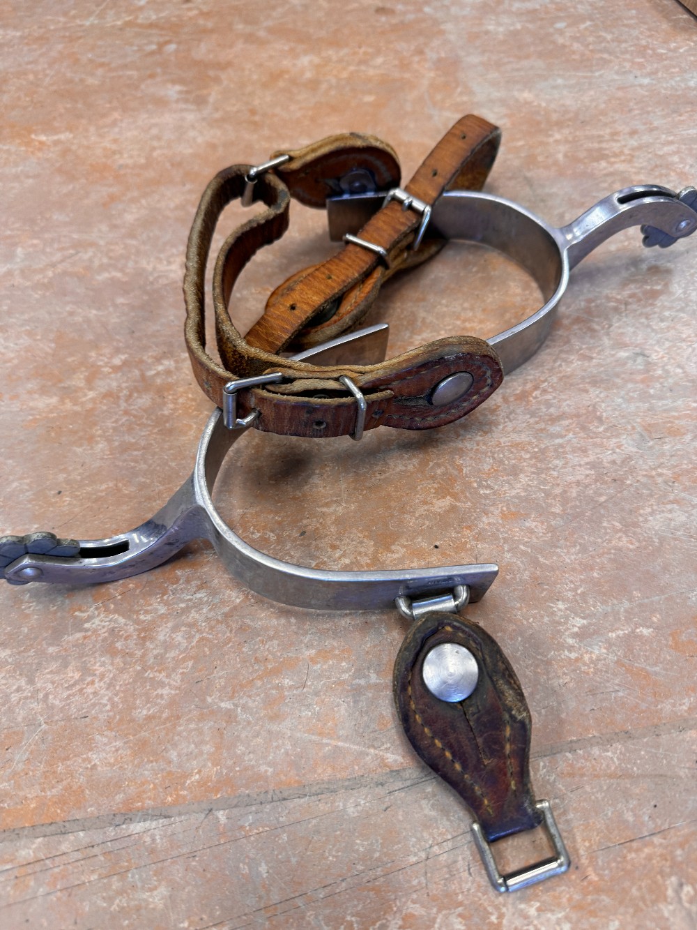 Daisey Rowel simple silver spurs w/ classic light leather spur strap