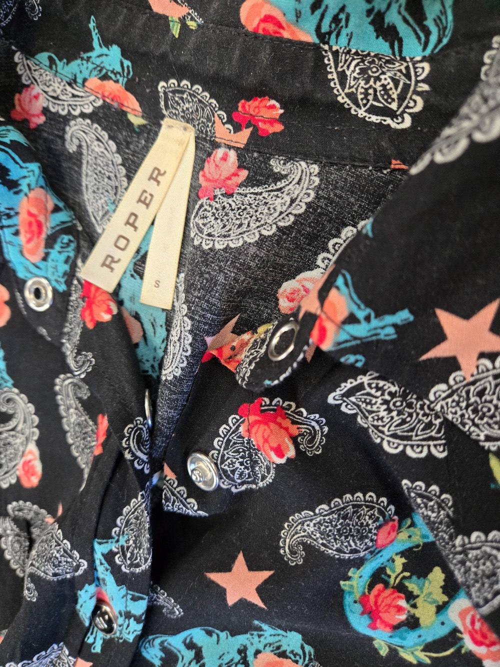 Home / Womens Apparel / Roper Paisley / Roses/ Rodeo print/ Snaps SMALL